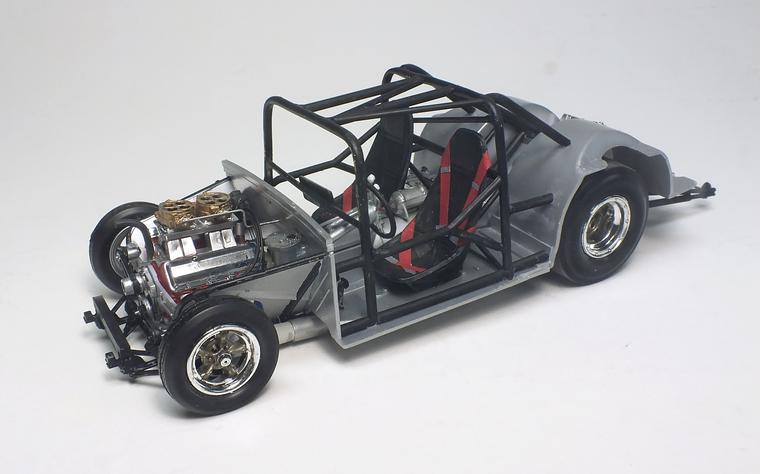 There was a fair amount of parts swapping to build this car from a Revell 32 Ford Sedan kit. The wire wheels came in the kit but they were modified to accommodate the giant rear tires. The engine came from eBay and looks pretty cool stuffed in the narrow engine compartment. The roll cage structure was scratchbuilt from styrene rod. The headers and grille are from other kits, too. The frame spreaders front and rear are 1/8" aluminum tubing. The paint is Tamiya Camel Yellow.