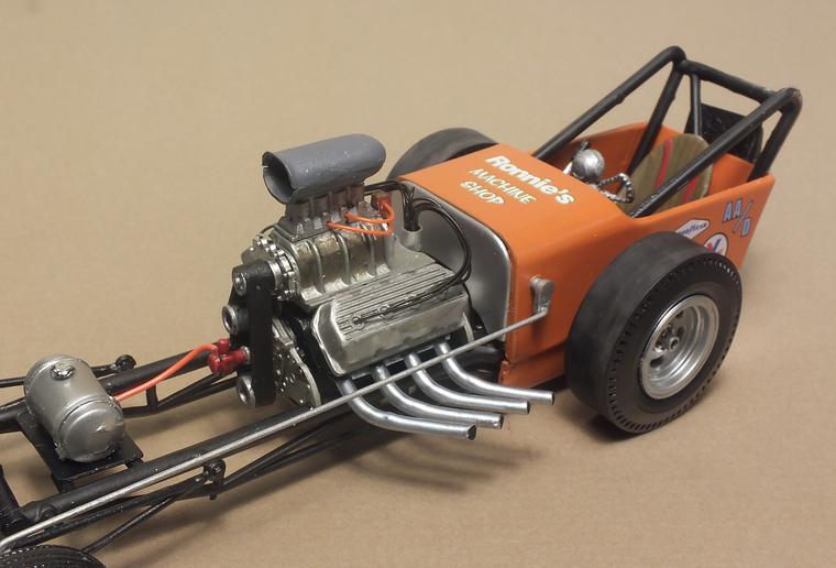 Starting with a kit of a stock '40 Ford, it was necessary to build the straight front axle from aluminum tube and brass wire and replace the stock rear axle/transverse spring with a larger axle and longitudinal springs from a pickup truck. The wheels, tires, carbs, velocity stacks, manifold, shocks, traction bars and decals are from other kits while the headers and wired distributor are commercially available items. The car was painted with Rustoleum Paprika semi-gloss spray paint.